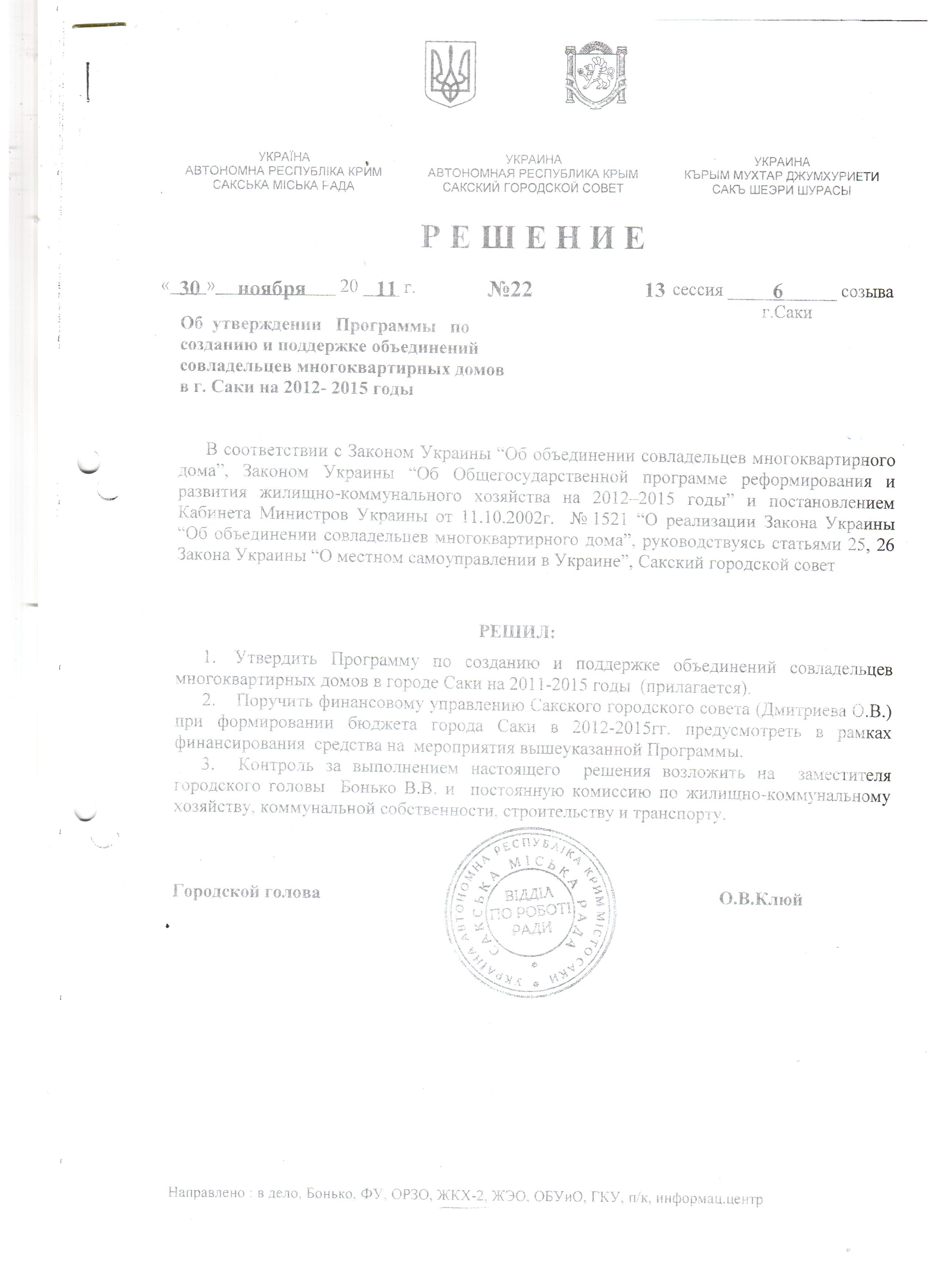 Программа по созданию и поддержке ОСМД в г. Саки, утвержденная решением Сакского горсовета АРК от 30.11.2011 № 22. Исполнитель: «Ассоциация развития местных инициатив Сакского района» (Юсупова Эльмаз Рустемовна).