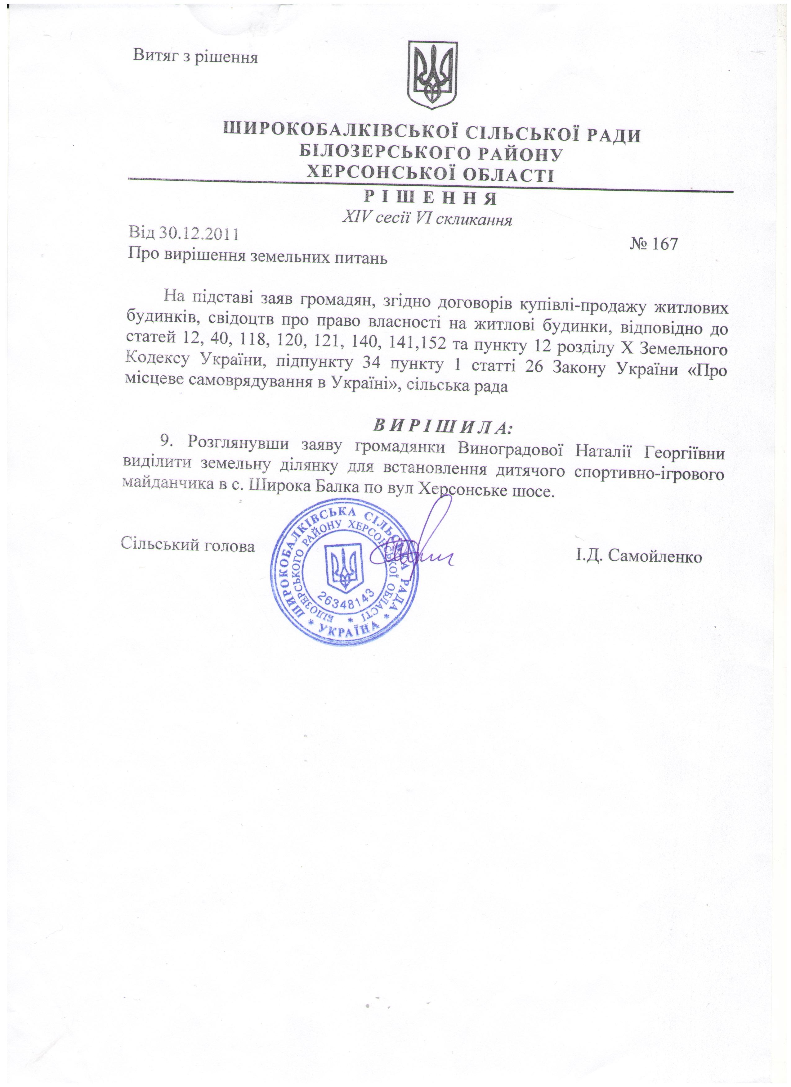 30.12.2011. Решение Широкобалковского сельского совета Белозерского района Херсонской области от 30.12.2011 № 167 о выделении земельного участка для постройки детской площадки. Исполнитель: Белозёрское районное отделение Херсонской области молодёжной общественной организации «Молодёжный центр регионального развития» (Виноградова Наталия Георгиевна).