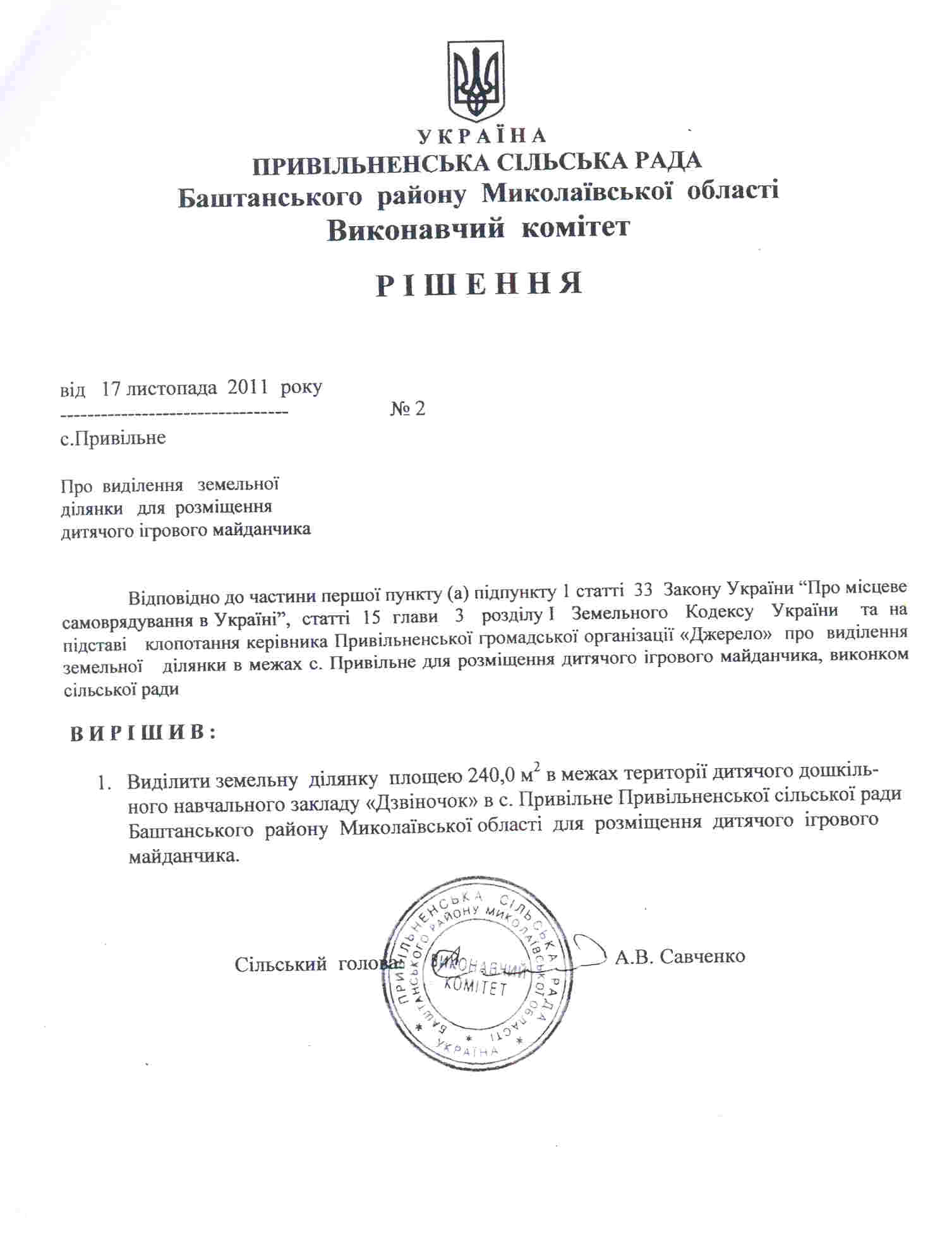 1. Привиольненская сельская общественная организация «Джерело» ( с. Привольное, Баштанского района, Николаевской области) Проект «Дети — наше светлое будущее» Решение Привольнянского сельсовета Баштанского района Николаевской области от 17.11.2011 № 2 о выделении земельного участка под детскую площадку. Исполнитель: ОО «Джерело» (Моспаненко Ольга Федоровна).