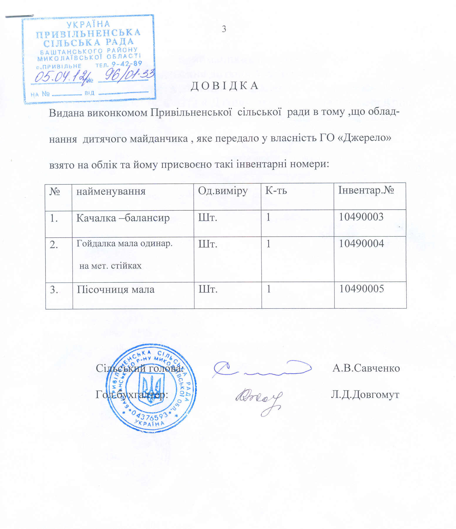 Справка Привольненского сельского совета о том, что оборудование детской площадки, которое пераданное ОО «Джерело» принято на баланс сельского совета.