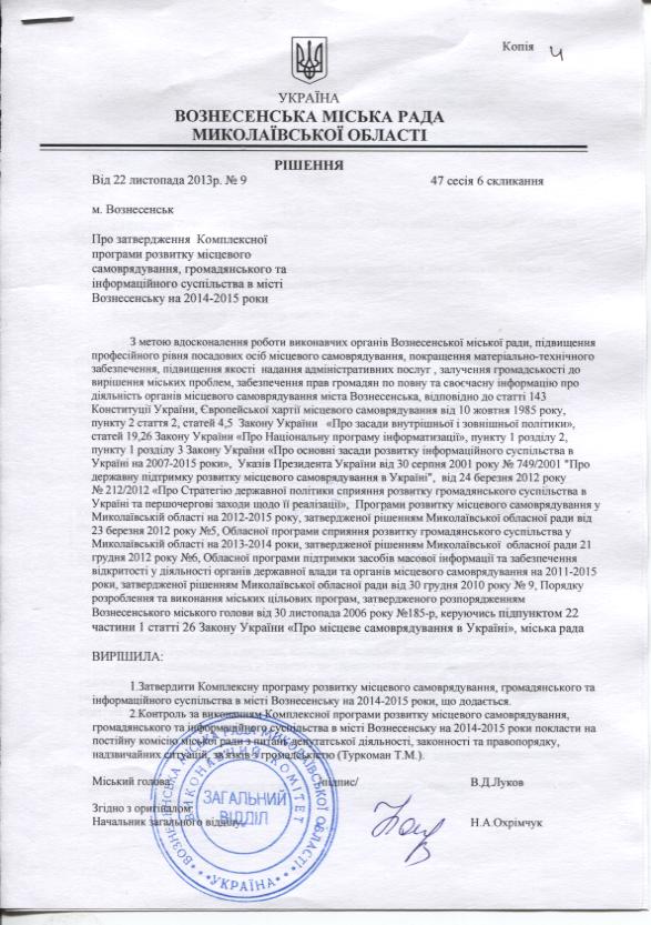 Рішення Вознесенської міської ради»Про затвердження Комплексної програми розвитку місцевого самоврядування, громадянського та інформаційного суспільства в місті Вознесенську на 2014-2015 роки» Скан копія рішення